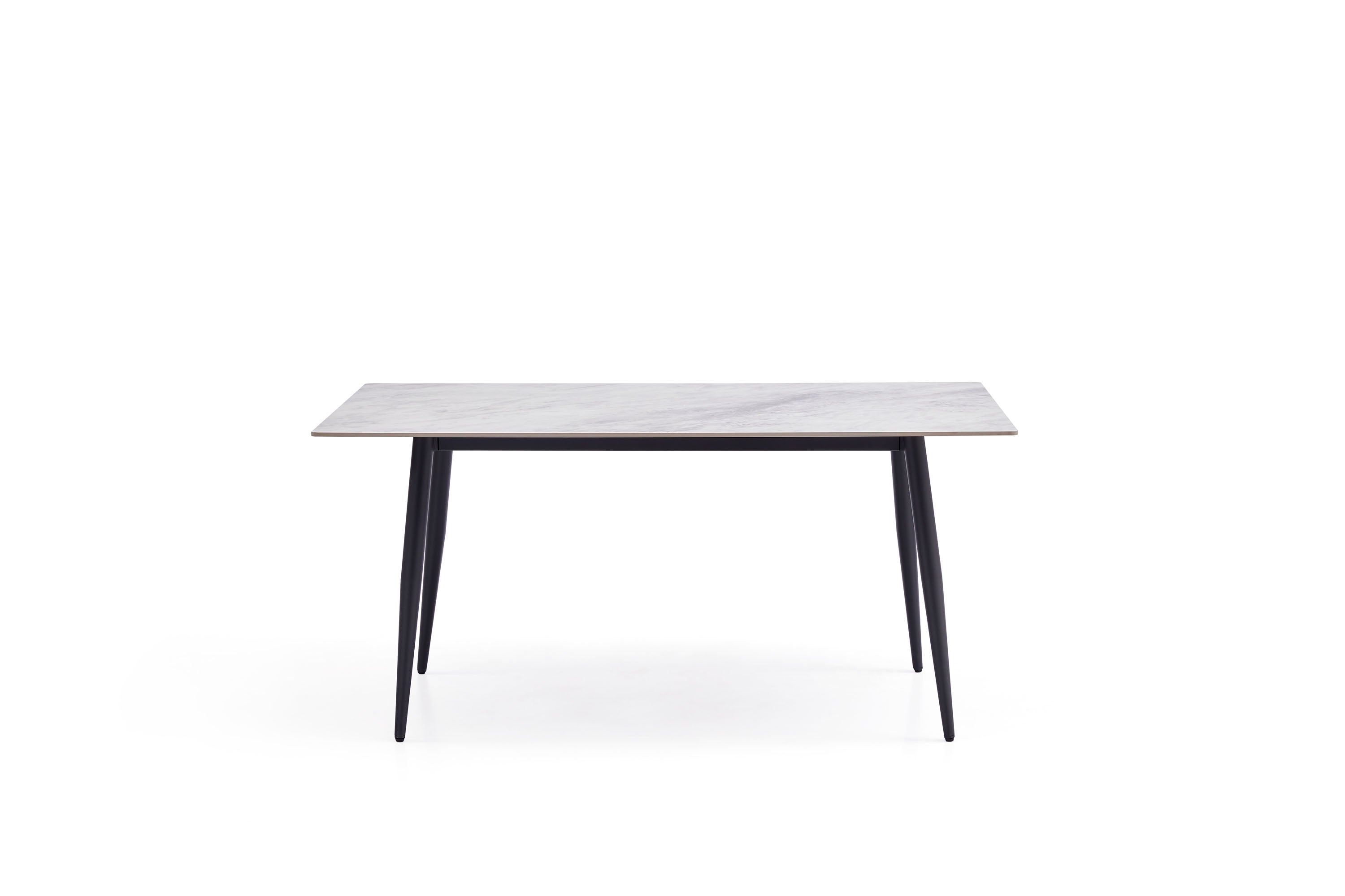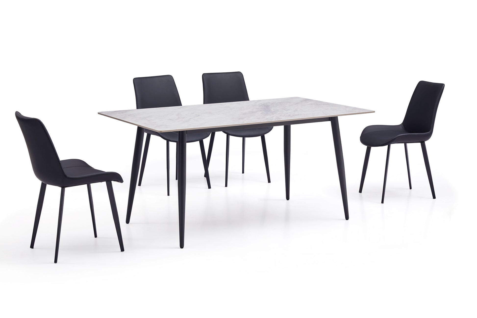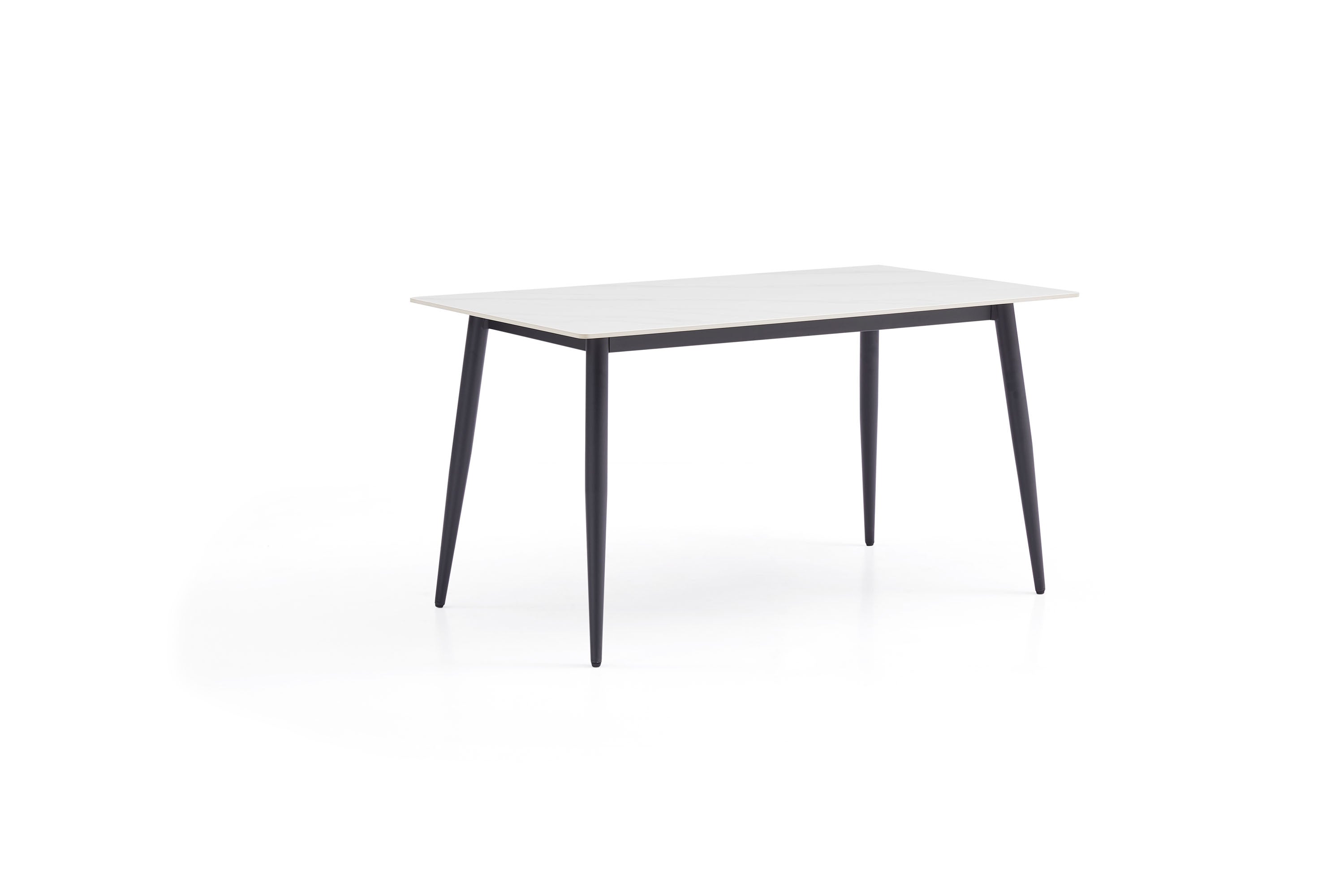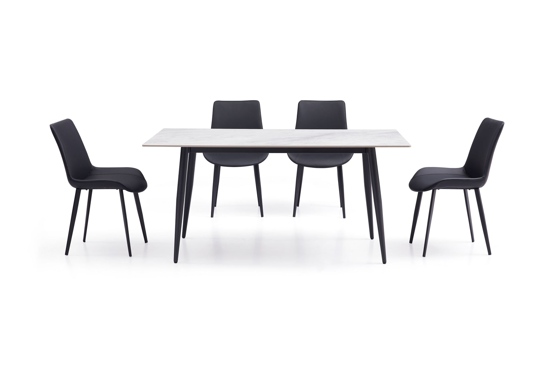 Table de salle à manger minimaliste avec piètement noir mat et plateau en pierre frittée