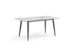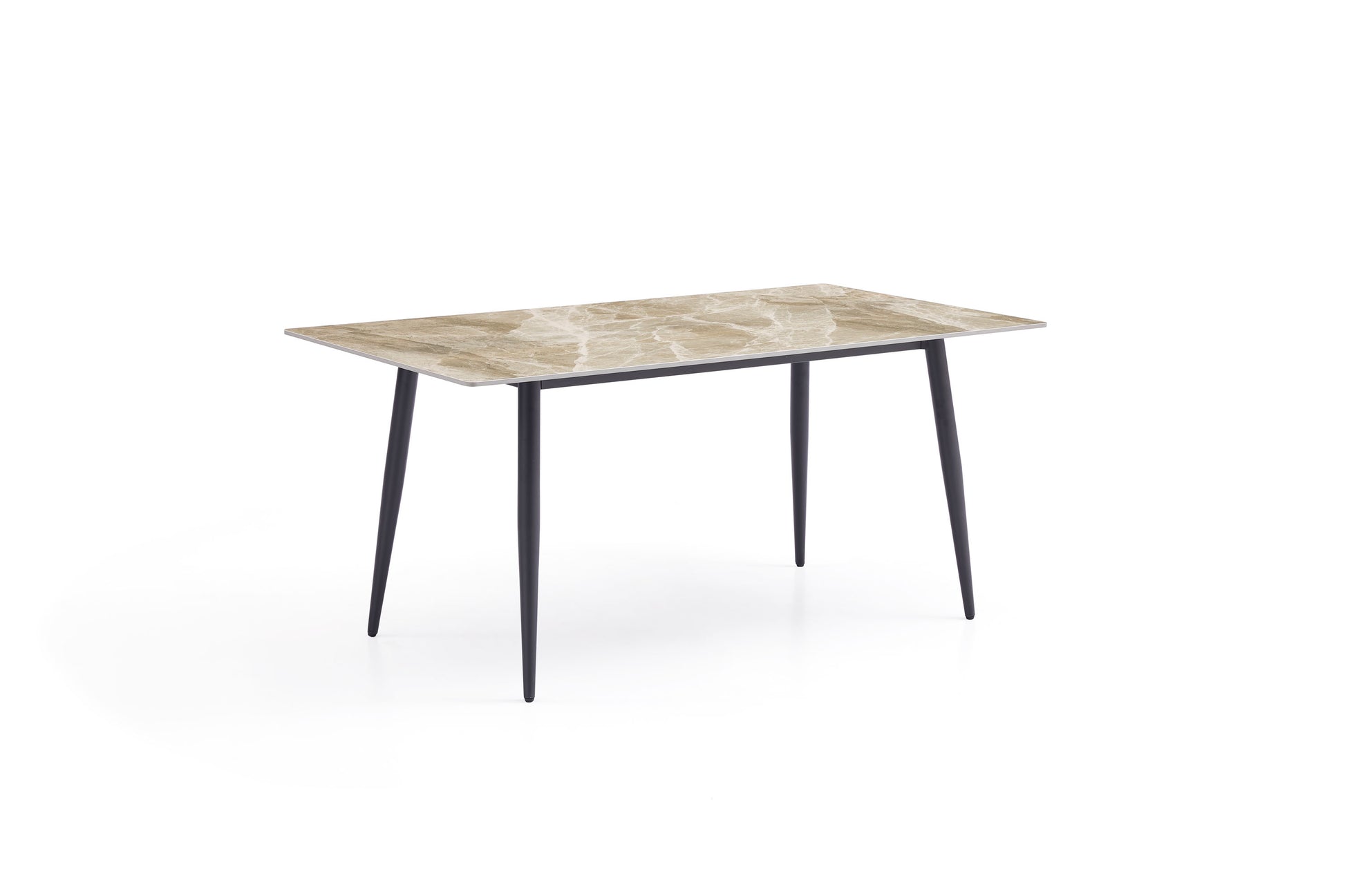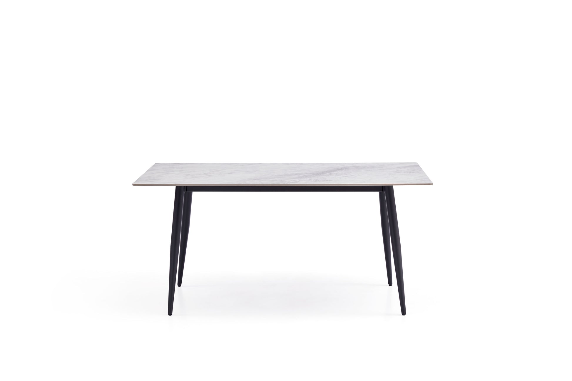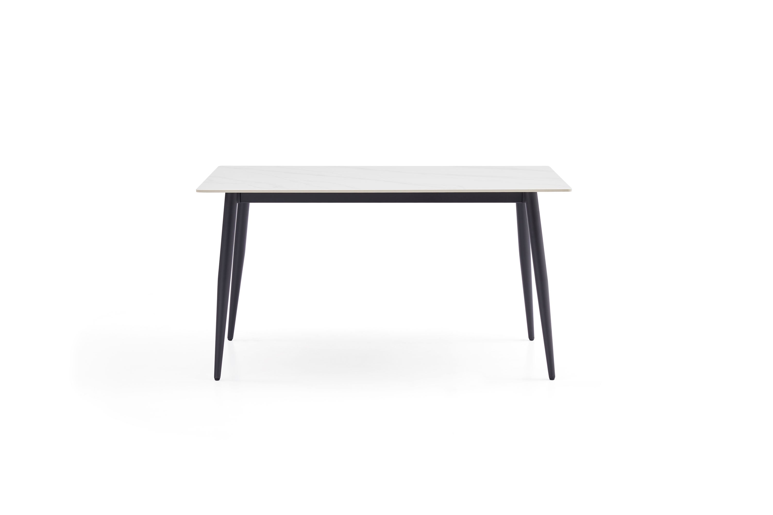 Table de salle à manger minimaliste avec piètement noir mat et plateau en pierre frittée