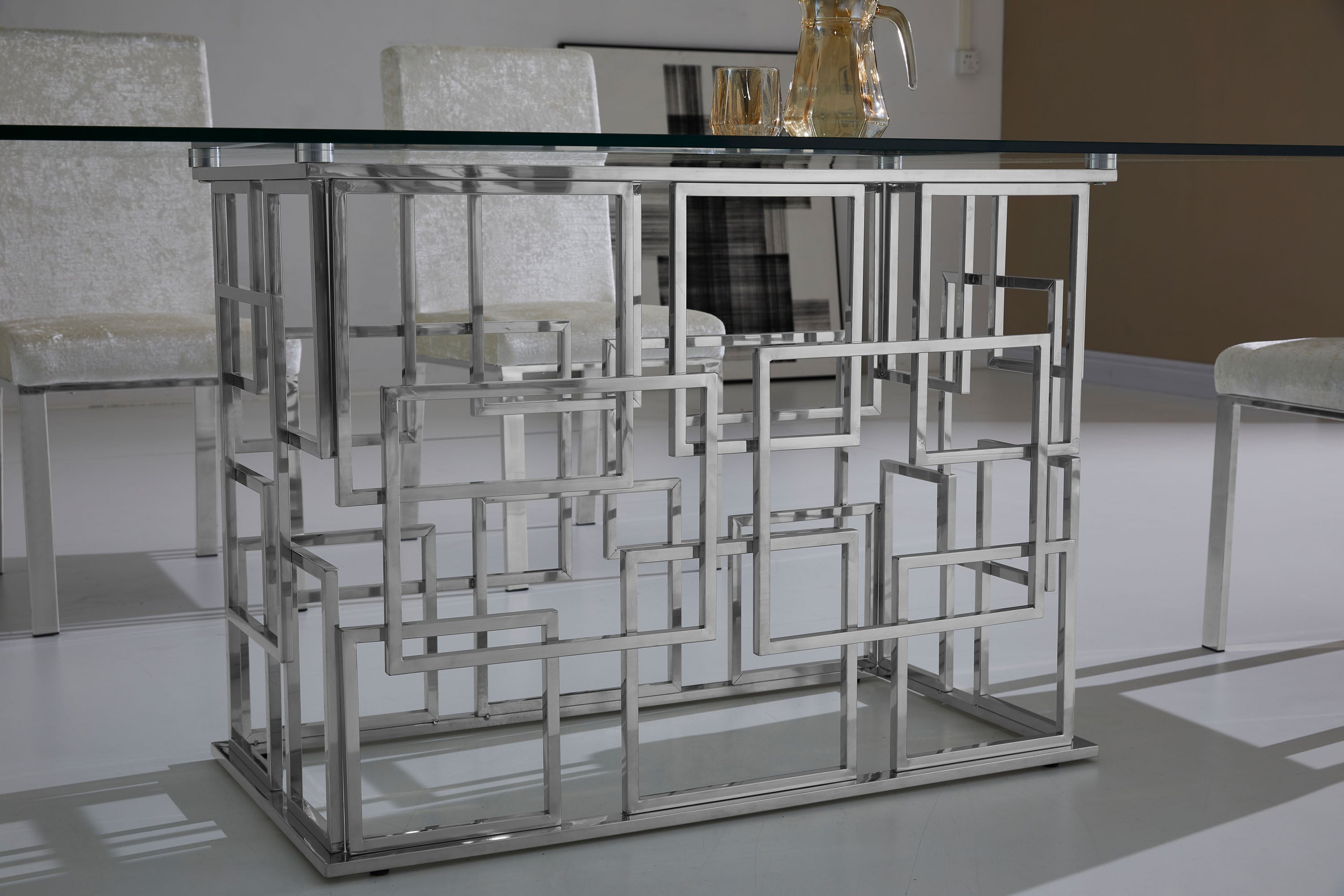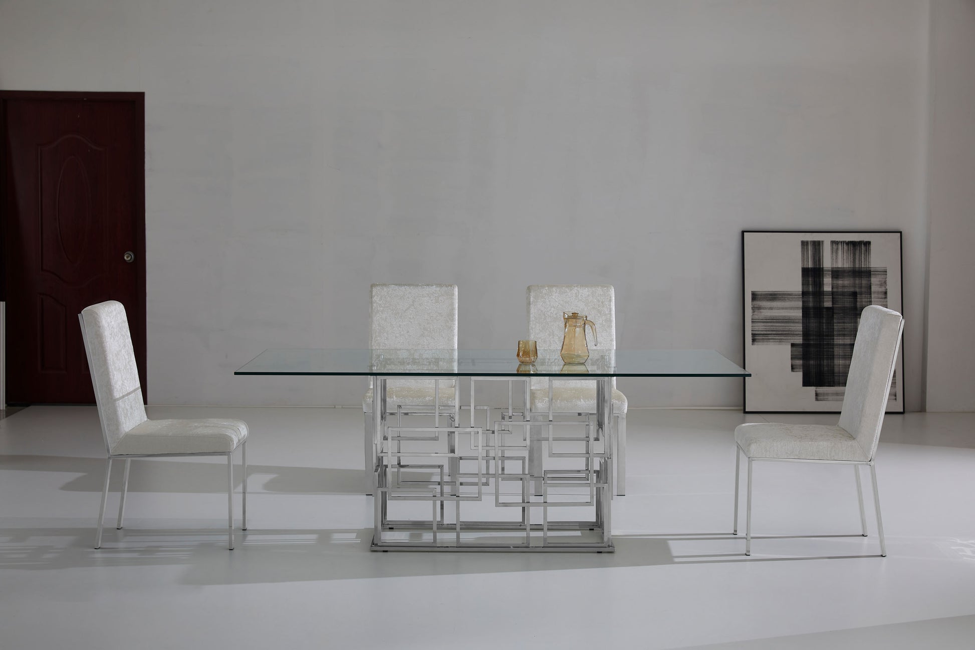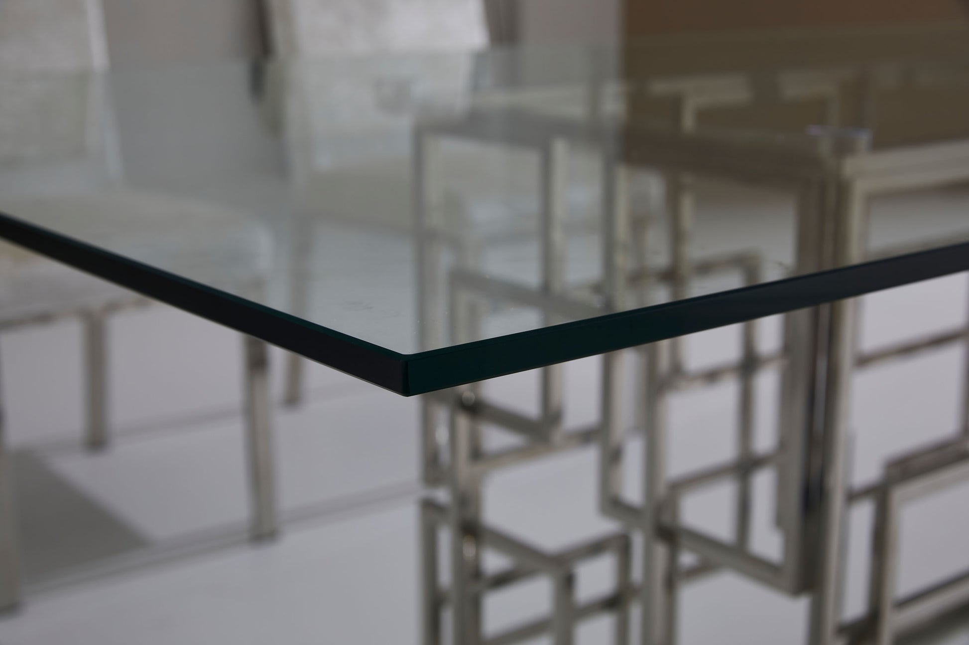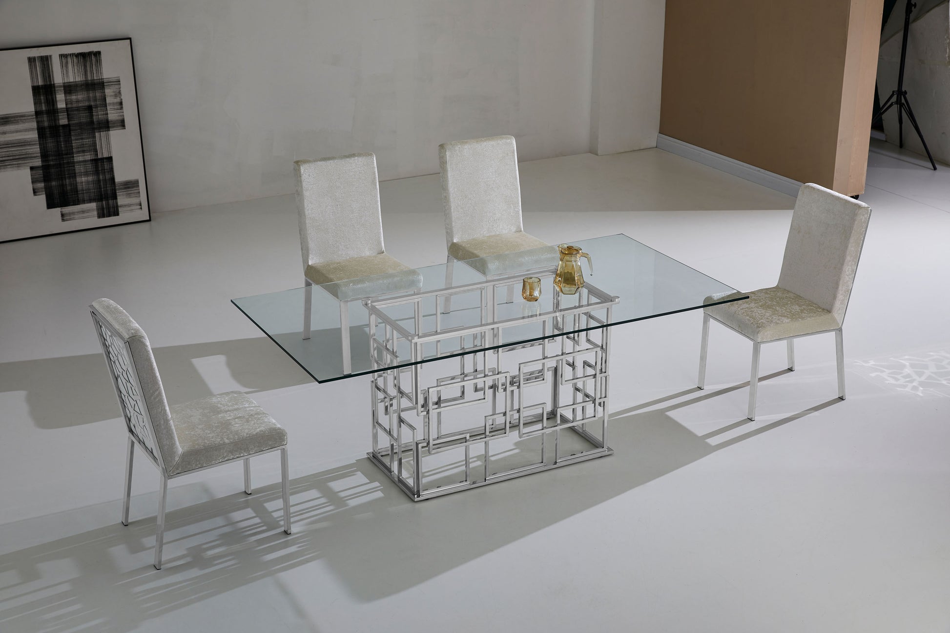 Table de salle à manger moderne et luxueuse argentée avec plateau en verre trempé