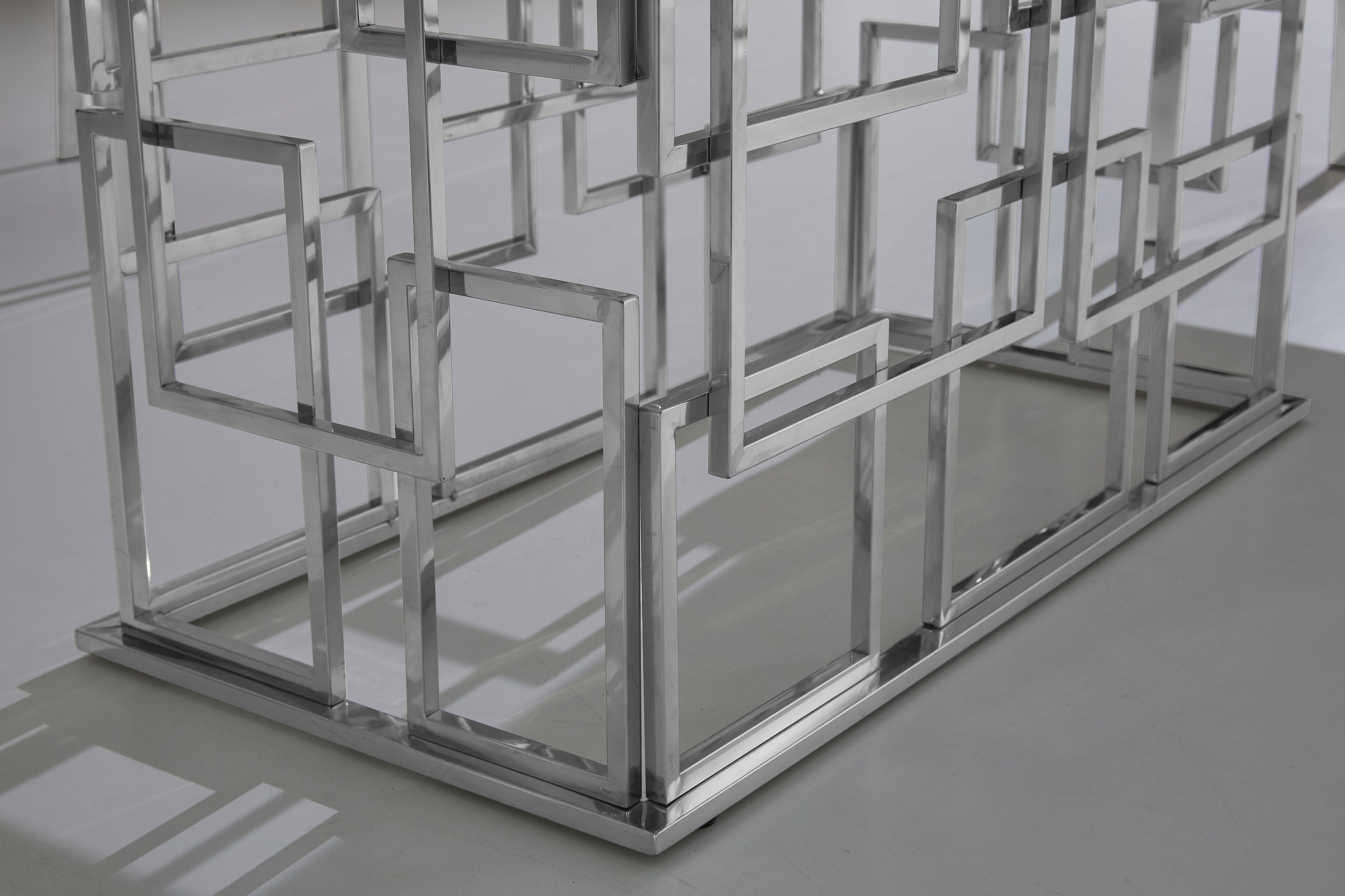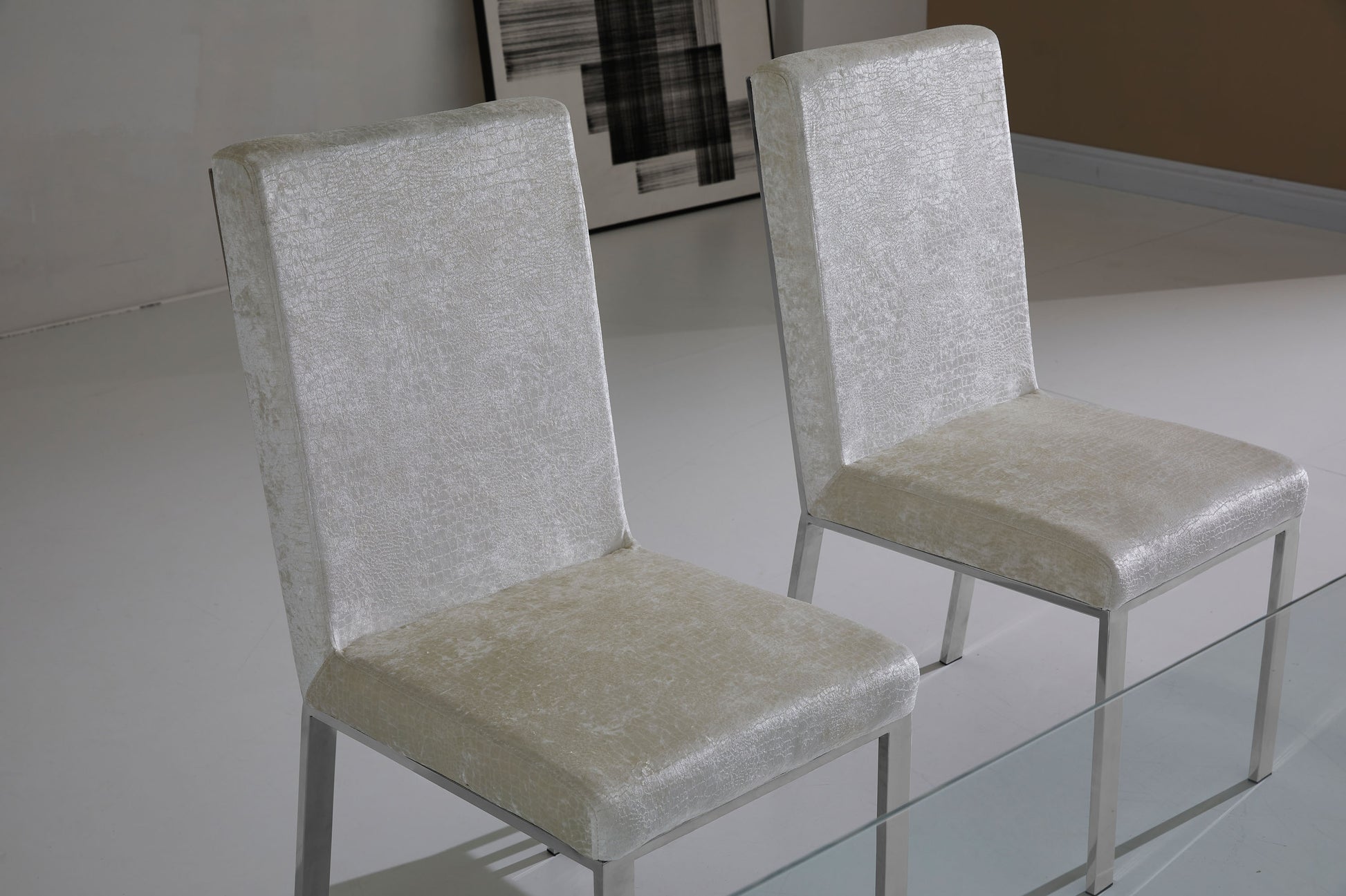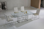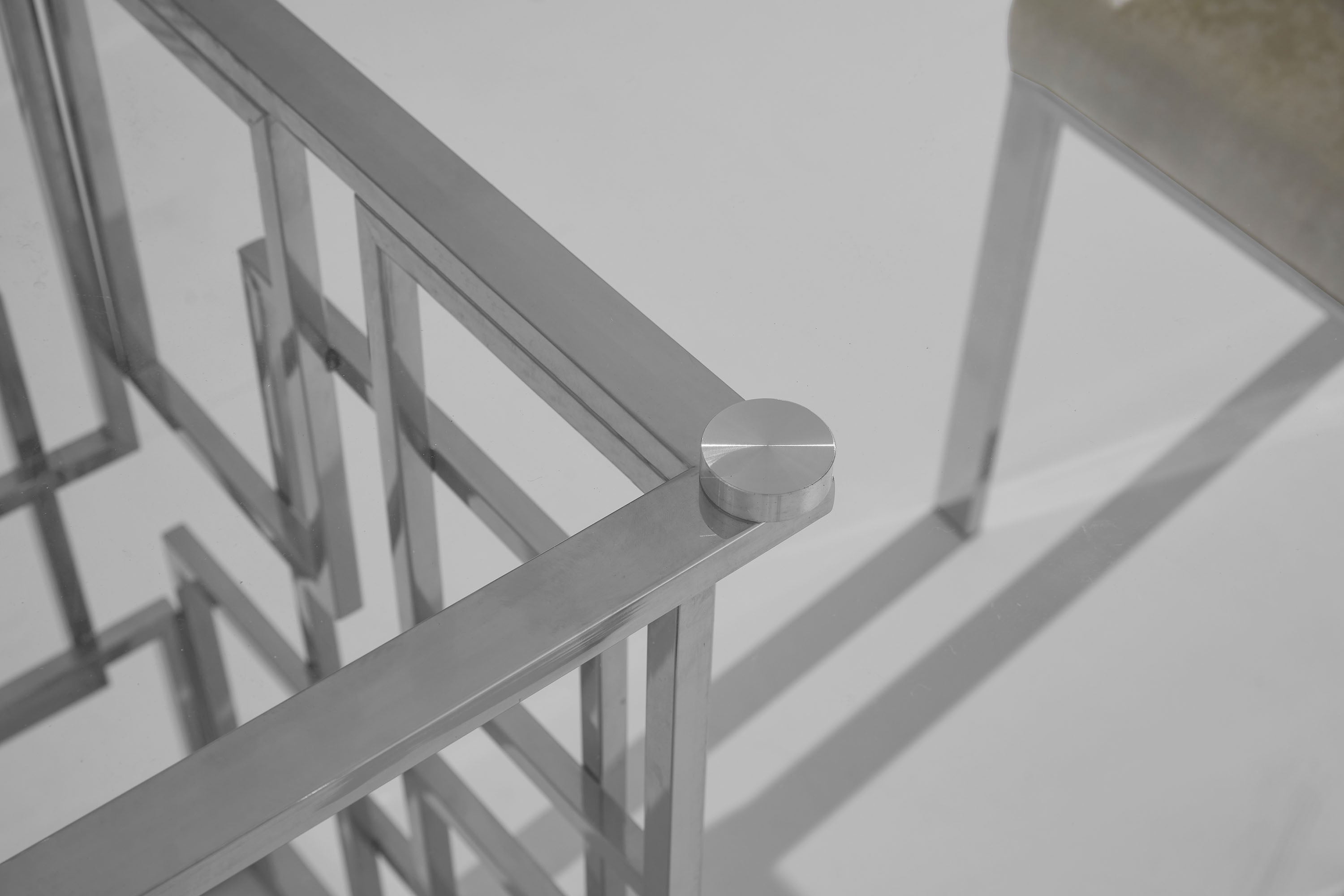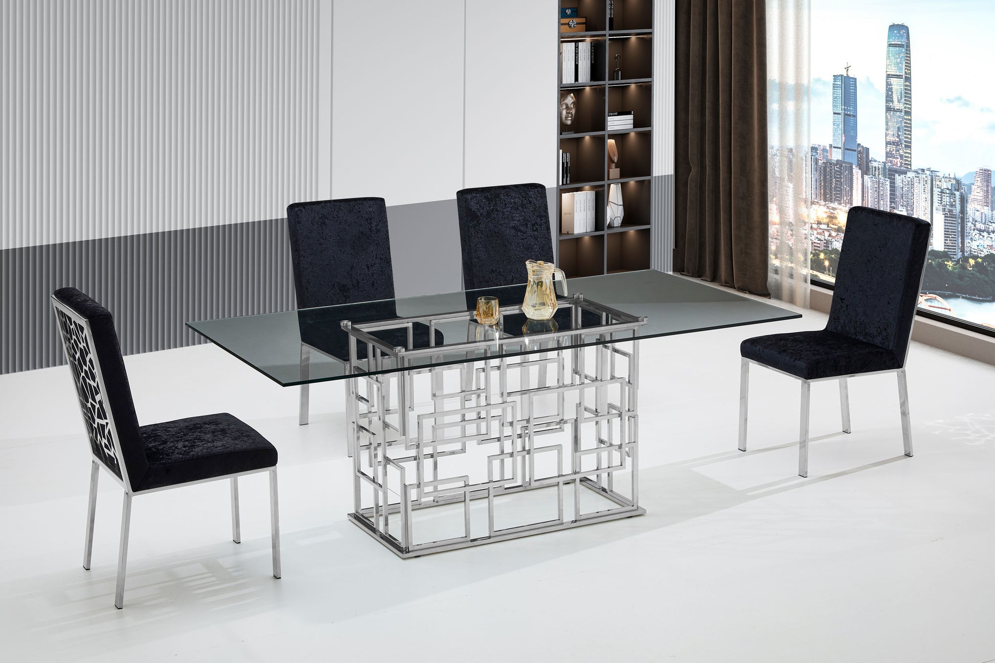 Table de salle à manger moderne et luxueuse argentée avec plateau en verre trempé
