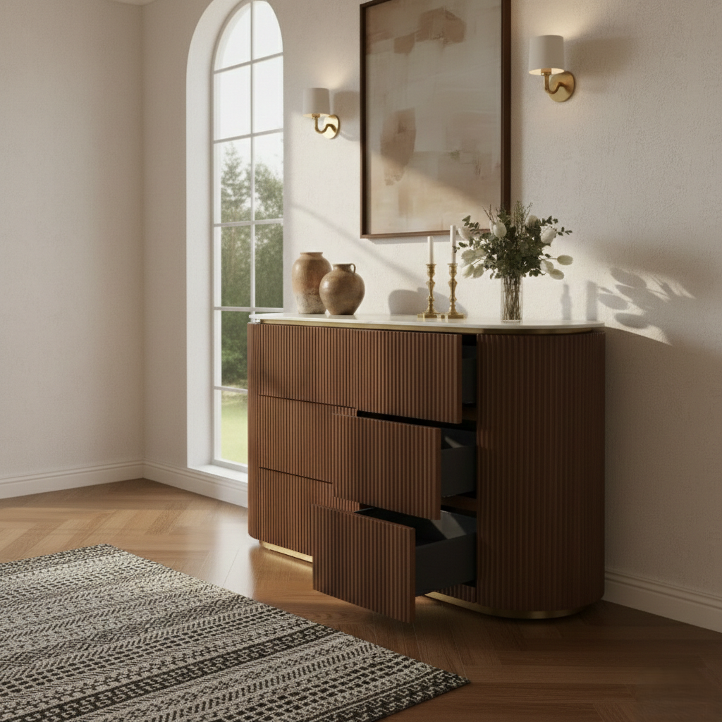 LUNE Modern Walnut Wood Gold Buffet With Sintered Stone Top